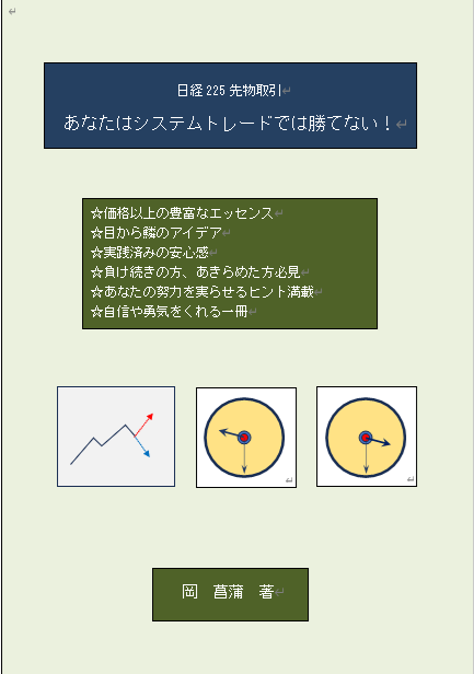 ![]() | 新刊「日経225先物 あなたはシステムトレードでは勝てない」のご紹介 〇日経225先物取引で思うように勝てない方向け 〇なぜシステムトレードでは勝てないのか詳述 〇投資人生の転機になるかも知れない、トレードの羅針盤的な教本 〇驚きのパフォーマンスを検証済み 〇リスクの取りようによっては、短期間で価格以上の成果を実現させる可能性あり 〇もれなく<Excel版実績管理表>を進呈 | 目 次 ・はじめに ・日経225先物取引について ・先物のメリット・デメリットおよびリスク ・本書を勧める対象 ・システムトレードとは ・システムトレードで勝てない理由 ・リアルトレード ・シチュエーション別解説 ・マイルール ・アプリでの具体的な注文方法 ・トレード終了後が大事 ・先物あるある ・閑話休題 ・失敗談と対策 ・更なる高嶺を目指して ・トレードの実績記録と分析 ・現物株式の損失をカバーできるのか ・スウィングトレードの危険性 ・まとめ ・終わりに ・参考資料 |