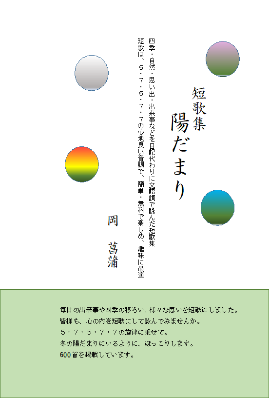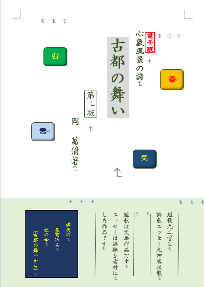 ![]() | お待たせをいたしました! 「心象風景の詩 第二版 電子版」が完成いたしました。 初版を見直しました。 できるだけ多くの短歌・詩歌・エッセーファンの方々にお読みいただきたく、原価割れの価格で提供、さらに消費税もブックスセファミィで負担させていただきます。 是非ともご利用ください。 ページ数;173ページ 大きさ;A5版 お届けのメールアドレスに送信いたしますので、送料無料、高速配達! お値段;300円 消費税;ブックスセファミィ負担 送料;なし | 目 次 [短歌]
