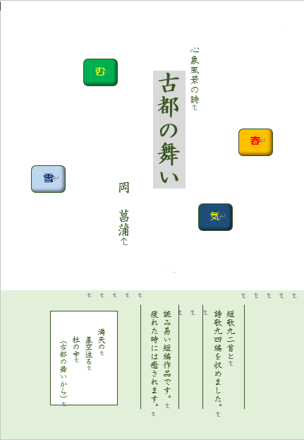 2025/2/10 2025/3/15 「心象風景の詩 古都の舞い 第二版 電子版」新発売! お得な価格300円で発売いたします。詳しくはナビゲーターの著作紹介頁の電子版をご参照ください。 2025/3/20 電子書籍として発刊したいあなたの原稿を募集しています。多くの方々の応募をお待ちしています。詳しくはこちら。 2025/3/23 1月の短歌と俳句を公開いたします。ご笑納ください! ブログに掲載中です。 2025/4/24 株価変動予測サポートシステム「株navi」新発売します。詳細は下記「新刊のご紹介」をご覧ください。 |