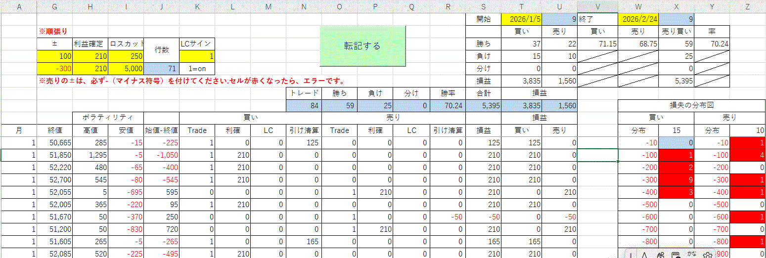 ![]() ![]() ![]() | 日経225先物取引シミュレーションソフトの予約販売開始キャンペーン開催 ただいま、このページは編集中です。 ソフトの内容や特徴 ・日経225先物取引での過去のデータに基づいたシミュレーションを行います。 ・3種類のバージョン(Ver)を用意しています。 1 Ver_A;日足分析 2 Ver_B;15分足分析(Ver_A添付) 3 Ver_C;パラメータ付Ver_B(Ver_A添付) 〇Point システムトレードは一般的に、過去データの再現性は極めて乏しいので、シミュレーション結果がリアルトレードでの投資成果に必ずしもつながらない、とも言われております。このソフトではシンプルなデータ指標しか用いていないので、不確実性は相当程度低下すると思われます。最近のデータでの試算では、80%前後での勝率を記録しています。かつその勝率や損益も比較的安定しています。 Ver_A(日足分析)では、ディセッション、ナイトセッション日足でシミュレートしています。つまり、1日2回のトレードを試算します。その試算結果はワンクリックで記録されます。この記録により、様々なパターンでの比較検討ができます。後述のVer_B(15分足分析)に比べ、その精度は荒くはなりますが、実際の成績より保守的(損失は最大にしてある)です。また、月別での勝率や損益が自動的に表示され、投資方針に安心や自信をもたらしてくれます。 Ver_B(15分足分析)は、15分足データを用いてシミュレーションを行います。Ver_A(日足分析)に比べ、精度は高くなります。 Ver_Cは、Ver_Bに弊社が得た最新の適正パラメータをも添付しています。お客様自身での数多くのシミュレーションを経ることなく、今のトレンドにあった指標を得ることができ、作業効率が高まります。ただトレンドは常に変化していますので、日時が経過するほど鮮度は落ちていきます。パラメータがトレンドに対応できなくなったときは、Ver_Cの販売を停止いたします。本Verをご検討の方は、お早目にお申し込み下さい。 価格が難だと思われるかもしれませんが、シミュレートした損益をご確認いただければ、ご納得いただけると自負いたしております。 但し、実践での損益はあくまでも自己責任であるということを改めてご認識ください。 価格(含む消費税)