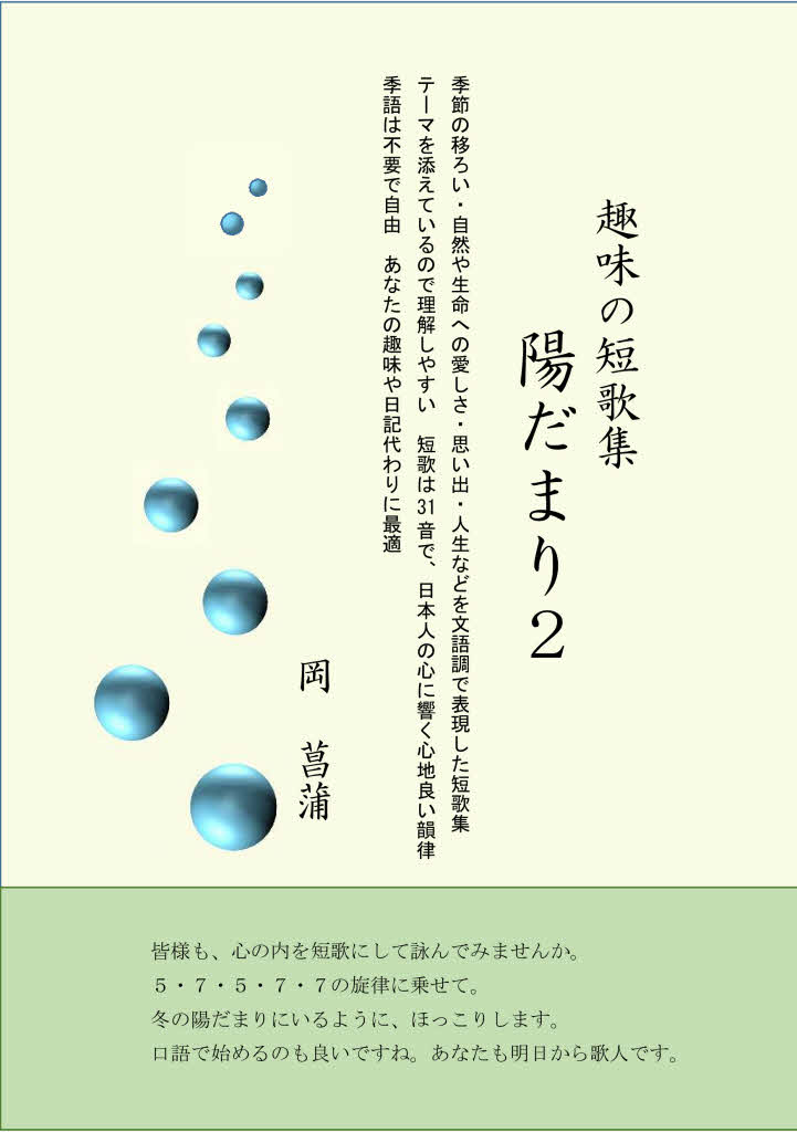 | 内容紹介 | 著作紹介3 「趣味の短歌集 陽だまり2」 「短歌集 陽だまり」の続編です。600首掲載した文語調の短歌集です。 季節の移ろい、自然や命への愛おしさ、思い出、人生観、世情などを短歌にして綴った作品を集めたものです。できるだけ、5・7・5・7・7の韻律を大事にしています。 文語調の短歌は、馴染みにくいという方もおられますが、日本語の言葉の豊富さ、微妙で繊細な表現、伝統的な日本の文化を味わうことができると思います。ある意味知的で優雅な趣味とも言えるでしょう。また、あなたの人生に新たな彩りを与えてくれるでしょう。もちろん、読むだけでも楽しさや癒しは得られます。ご自身で短歌作りを始める際は、もちろん、口語作品もありです。 読者の方々にも、ぜひ、身近に短歌の楽しみを味わっていただきたいものです。 (一部、次の作品も含まれています。口語作品、意味を変えない範囲内で、韻律を優先させた作品、音数が31音と異なる作品、諸事情により一部伏字にしている作品) |